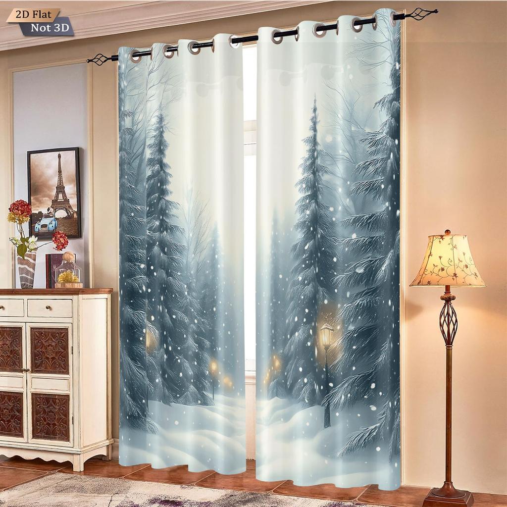 Set Of 2 Winter Christmas Snowy Forest Printed Shade Curtains Insulation Multi Size Living Room Holiday Decoration Curtain Polyester Machine Washable