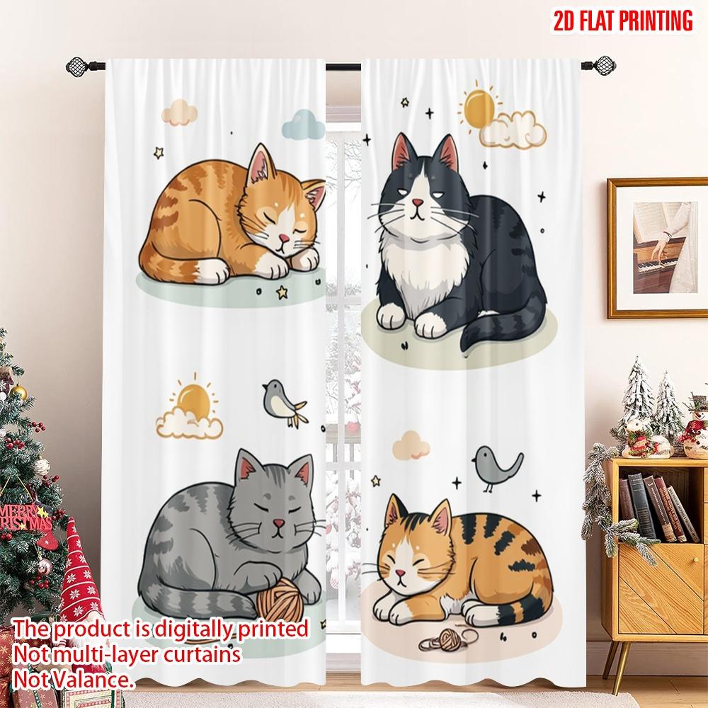 Set Of 2 Flat Printing Curtain Cute Cat Illustration Digital Printed Polyester Drapes All Season Party Holiday Decor