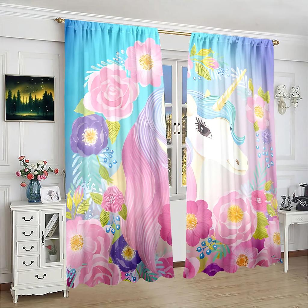 Unicorn Flower Fantasy Curtains Piece Polyester Set Bedroom Living Room Study Magical Whimsy Window Decor Curtain For Sitting Made Of