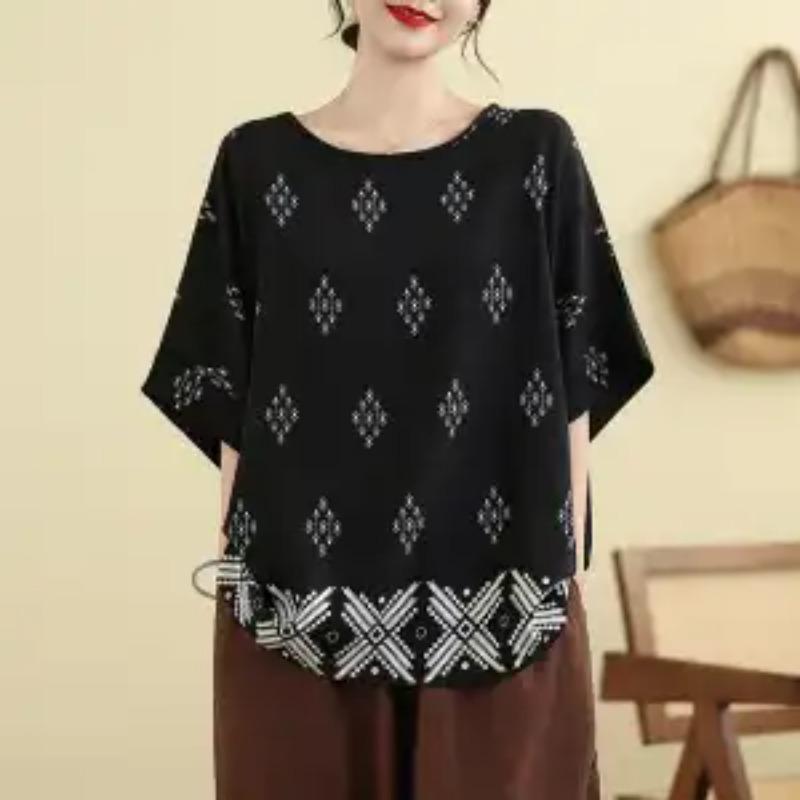 Sommer Schwarz Ethnisch Bedruckte Bluse für Damen Fledermausärmel Lässiges Oberteil