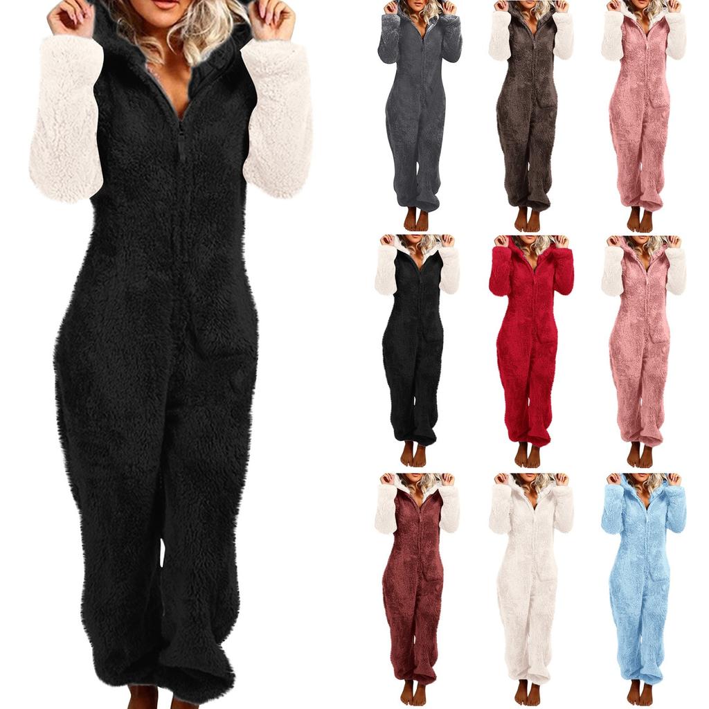 Damen Langarm-Overall mit Kapuze, Pyjama, lässiger Winter-warmer Strampler, Nachtwäsche