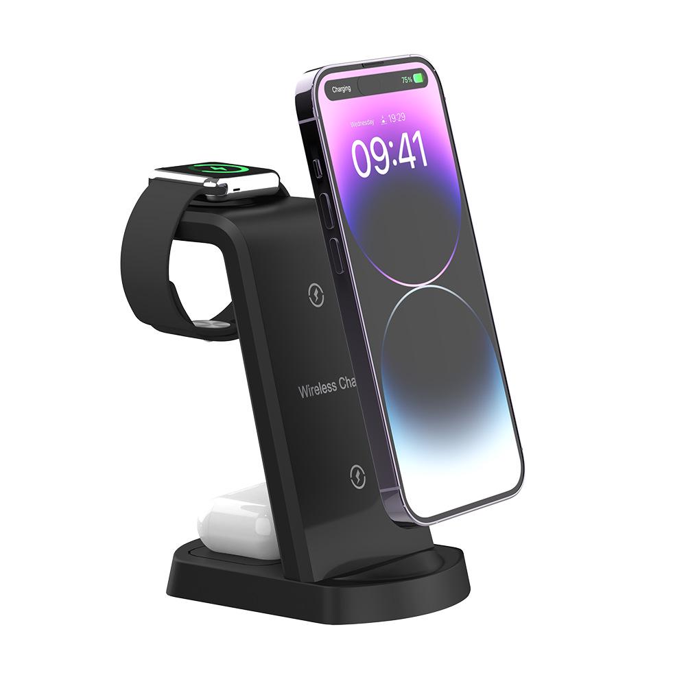 Three-in-One Vertical Wireless Charger for Apple Devices: Phone, Earbuds, and Watch.