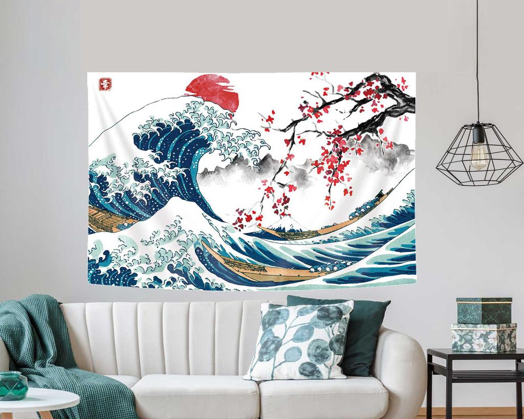Japanese Wave Tapestry Flat Printed Cool Anime Style Red Mountain Sun Sakura Ocean Wall Hanging for Room Decor