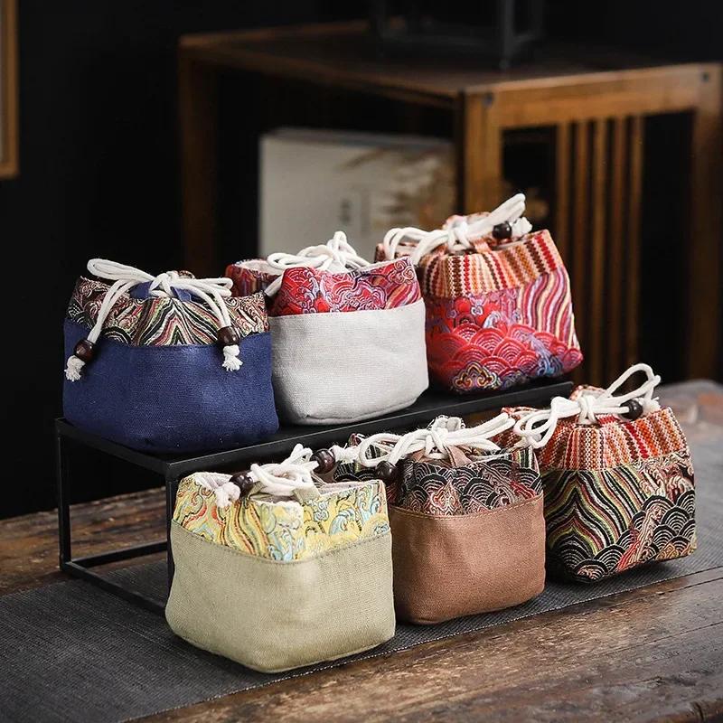 Vintage Teegeschirr Aufbewahrungstasche für Outdoor-Reisen Keramik-Teetassen Baumwoll- und Leinen-Kordelzug-Stofftaschen Kung Fu Teezubehör