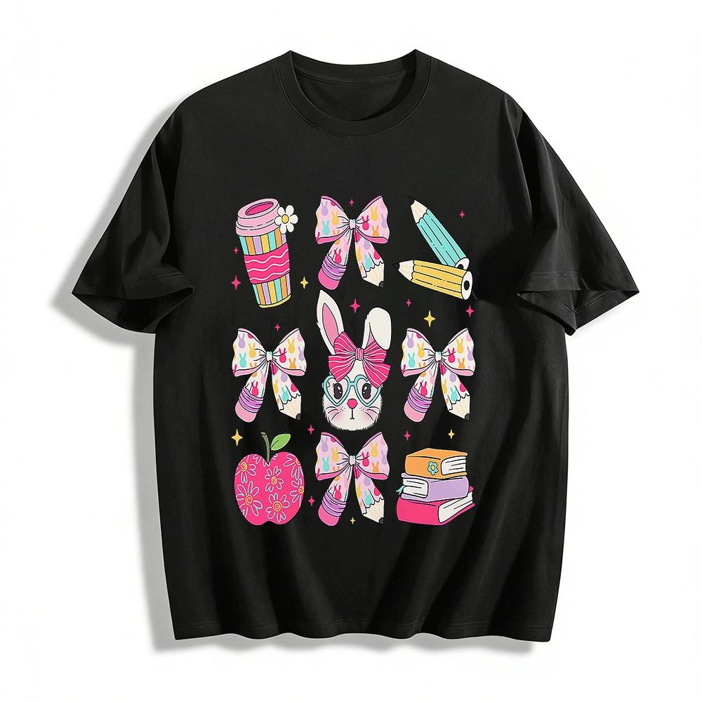 Süßes Kaninchen Schleifenprint Oberteil Kinder Campus Stil Lässiges T-Shirt Reines Baumwoll-T-Shirt