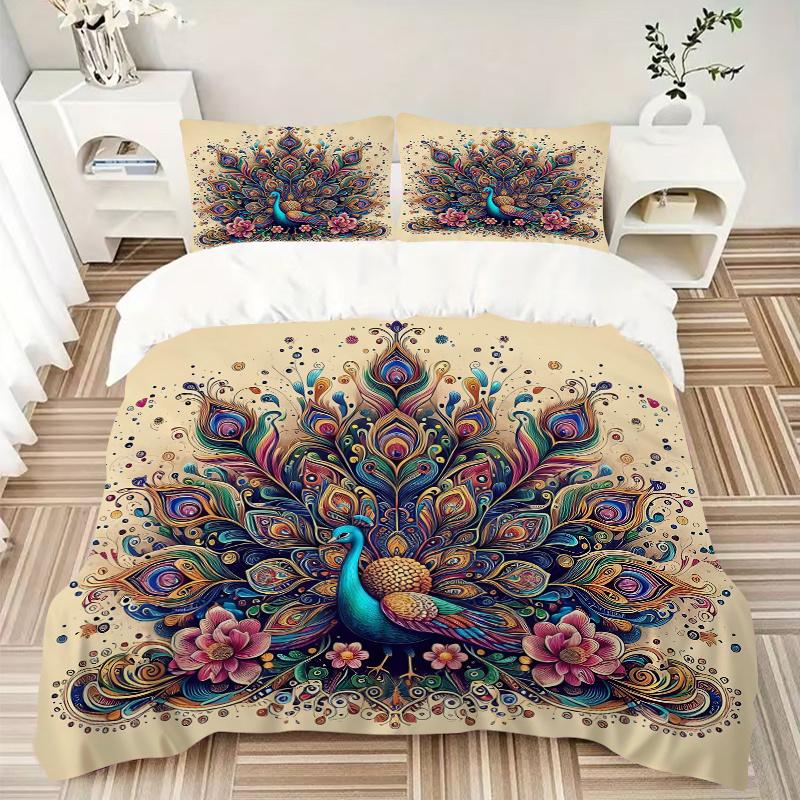 3pcs Nature's Beauty Peacock Quilt Cover Set - Soft and Cozy Bedroom, Guest Room and Dorm Decorative Bedding 3-Piece Set 1 Quilt Cover + 2 Pillow