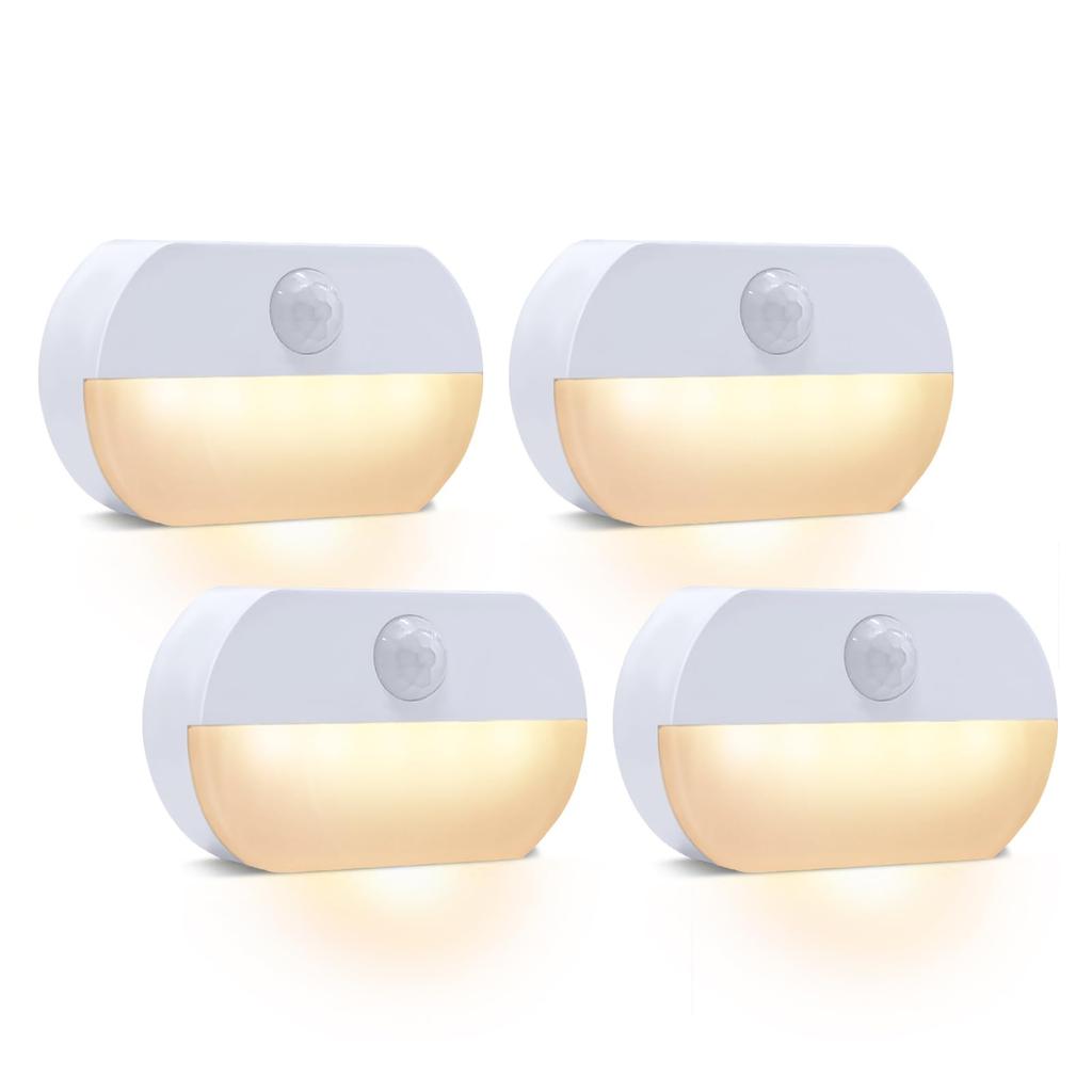 AmmToo LED Sensor Lights, Battery Operated, Warm White, 4-Pack, Footlights, Motion Sensor, No Wiring Required, Automatic On/Off, for Stairs, Toilets, Hallways, Refrigerator Lighting, Entrances, Closets, and Rooms, Small Size, Double-Sided Tape Included, Batteries Sold Separately, with Cover