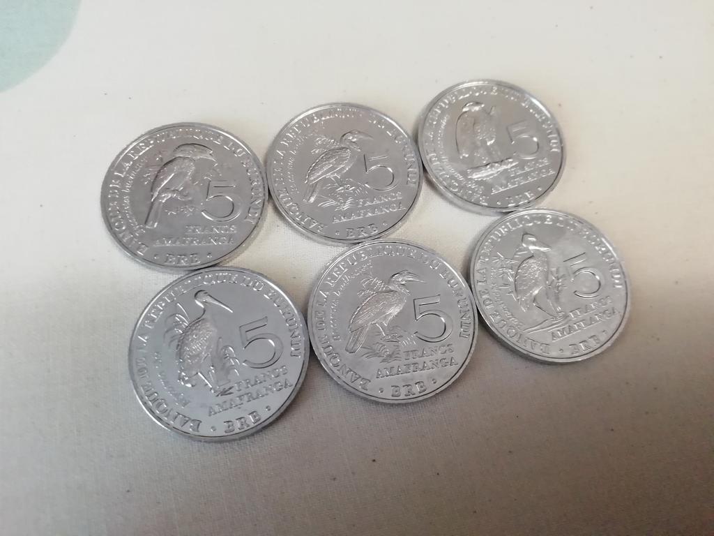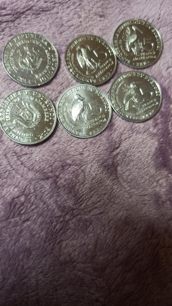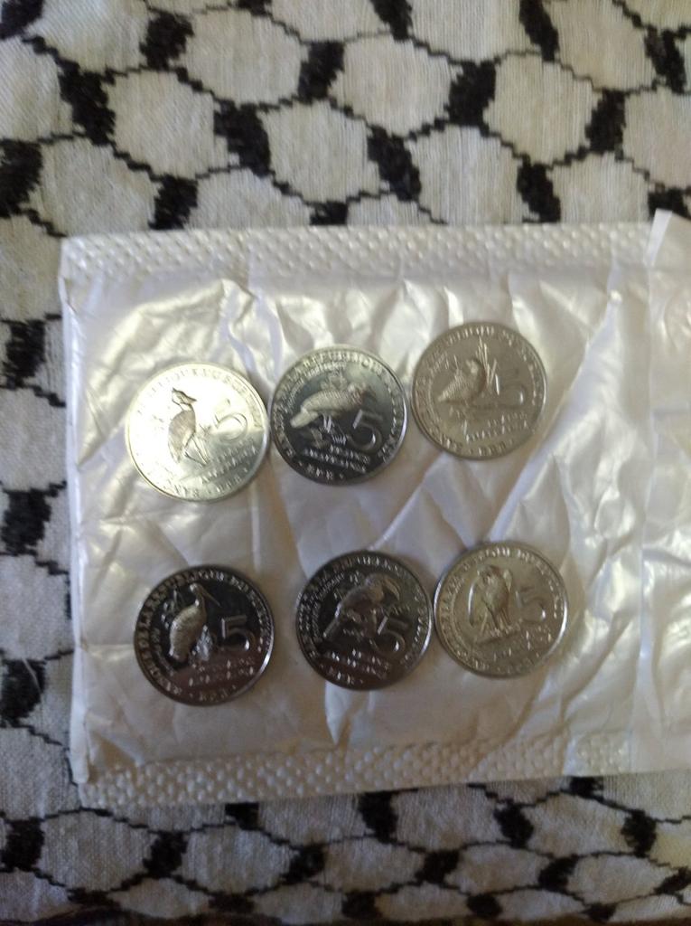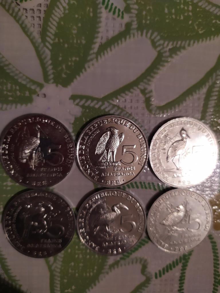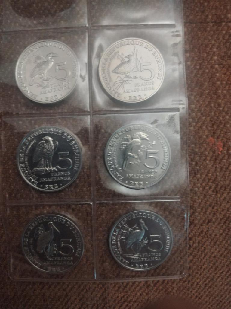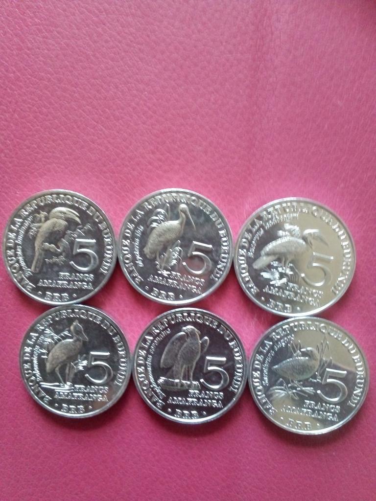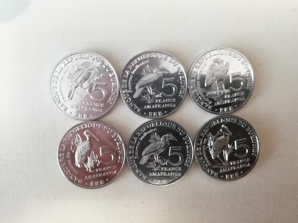 6 different coins of Burundi, denomination of 5 ore, with the image of birds. The aluminum ones are very light.
