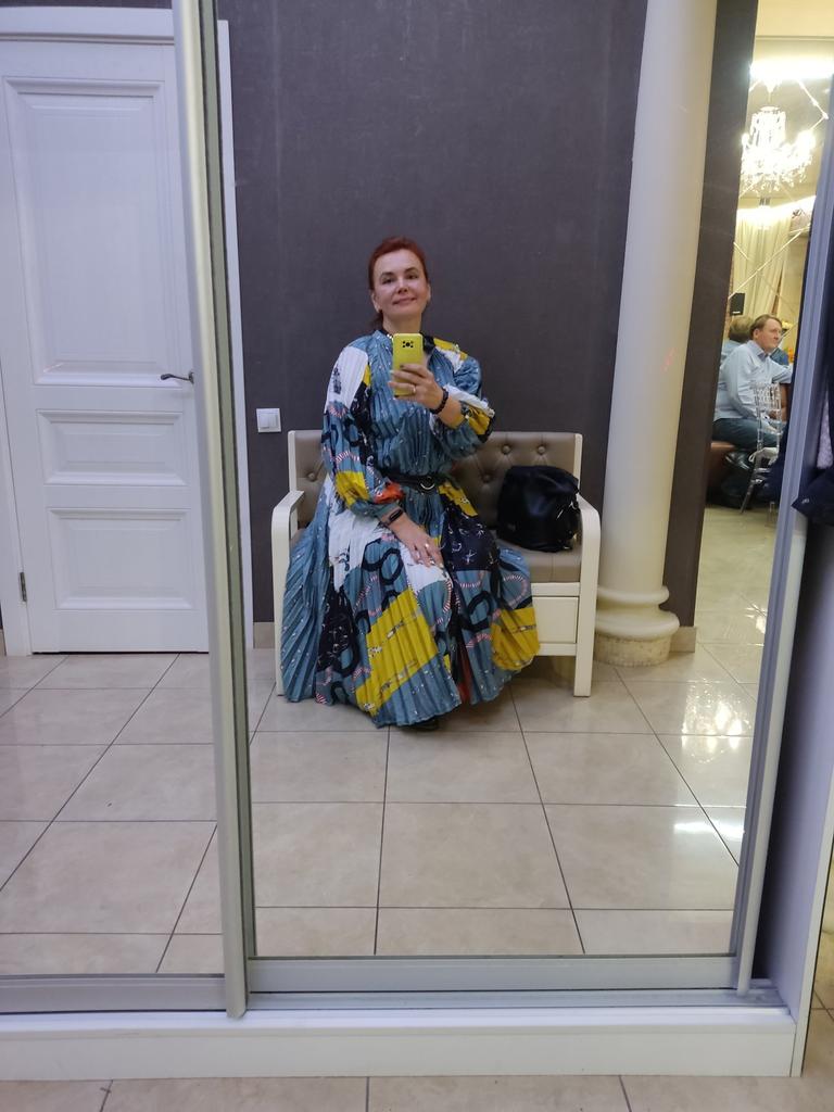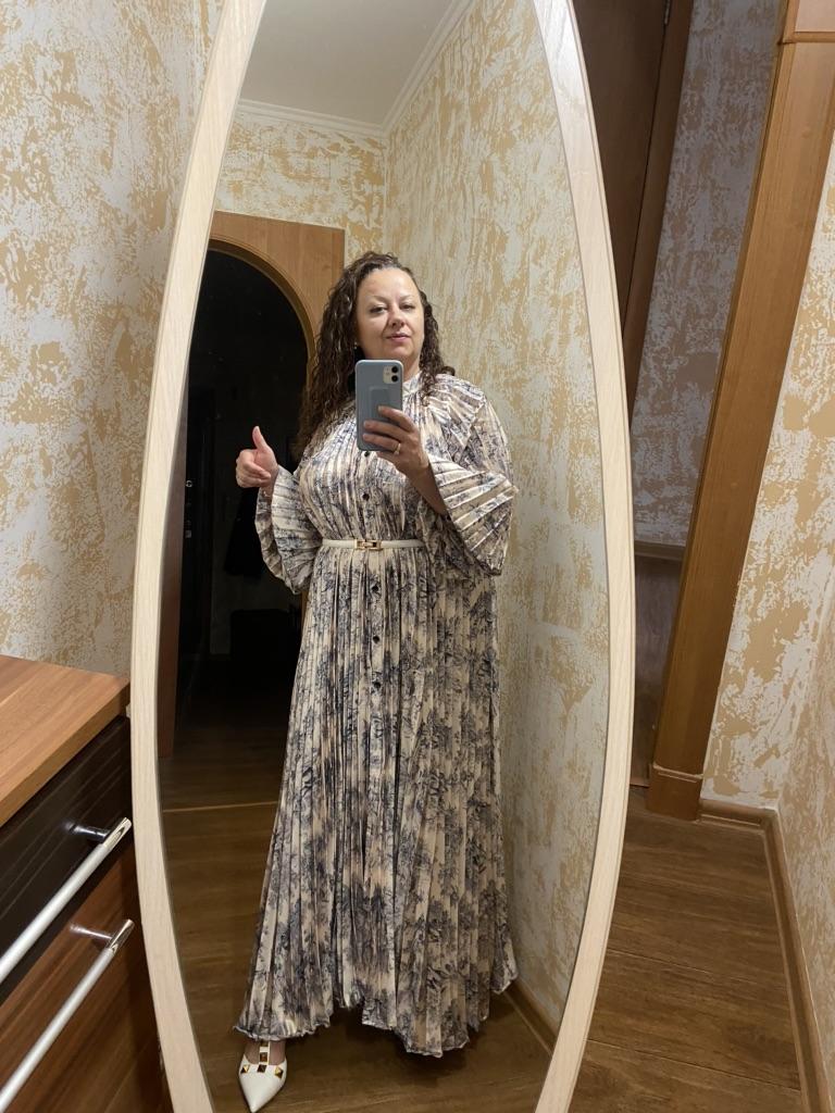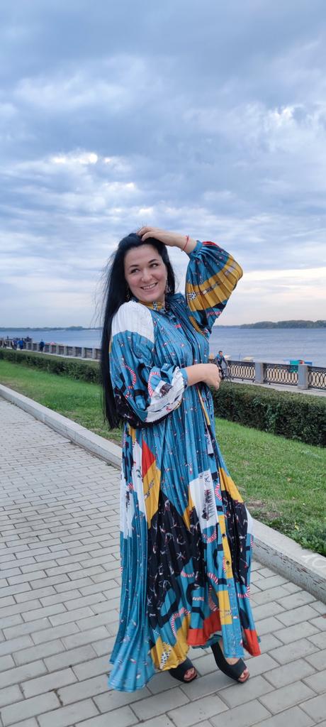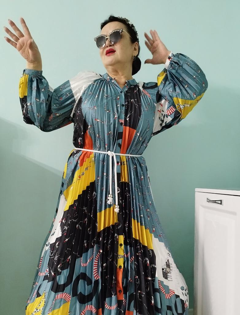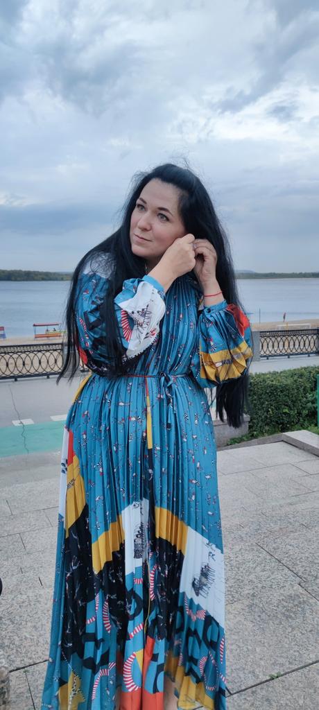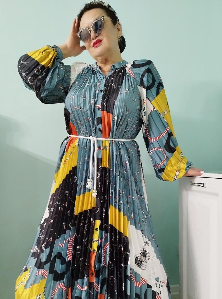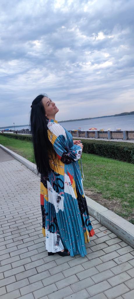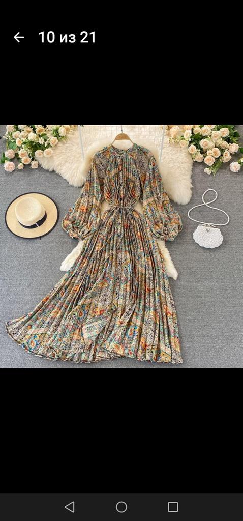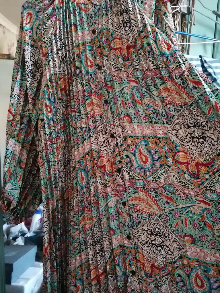 Very beautiful long dress, loose, long sleeves and with sun pleats that start at the neckline. 👍💐 The fabric is light but polyester. The small patterns are beautiful with vibrant colors. 🎉💘