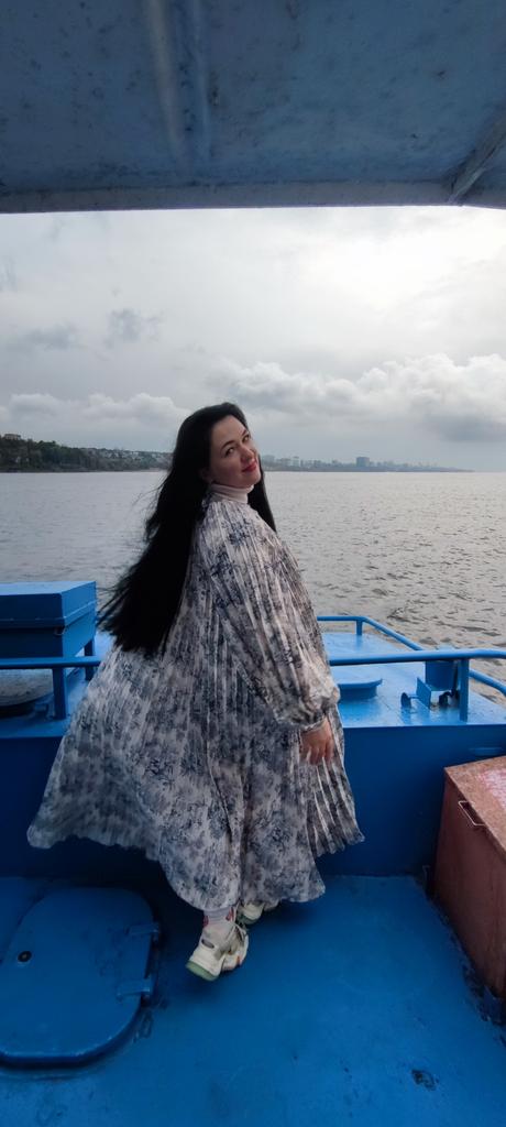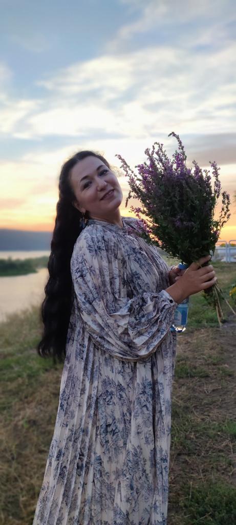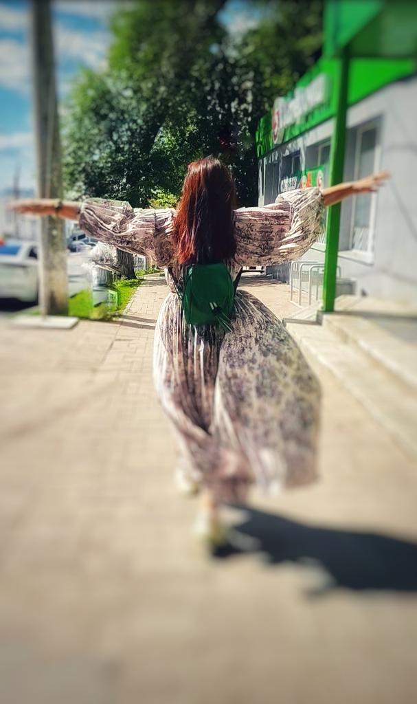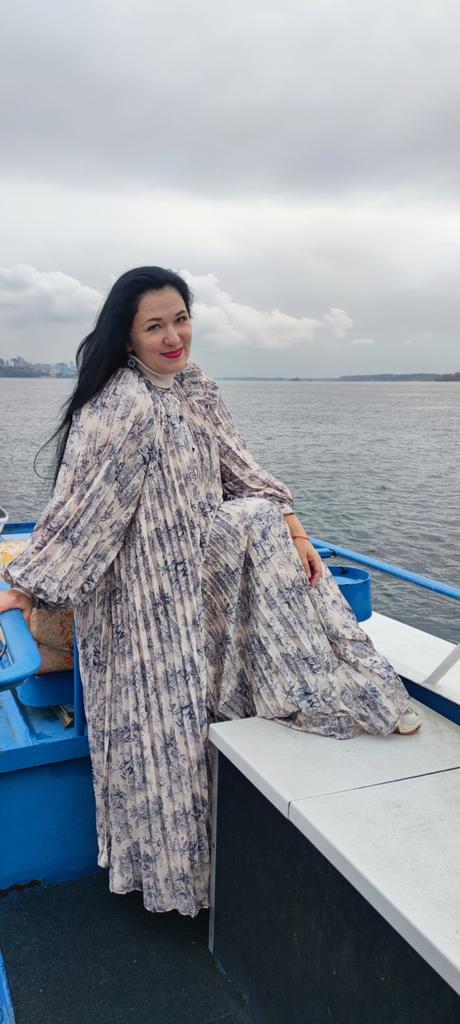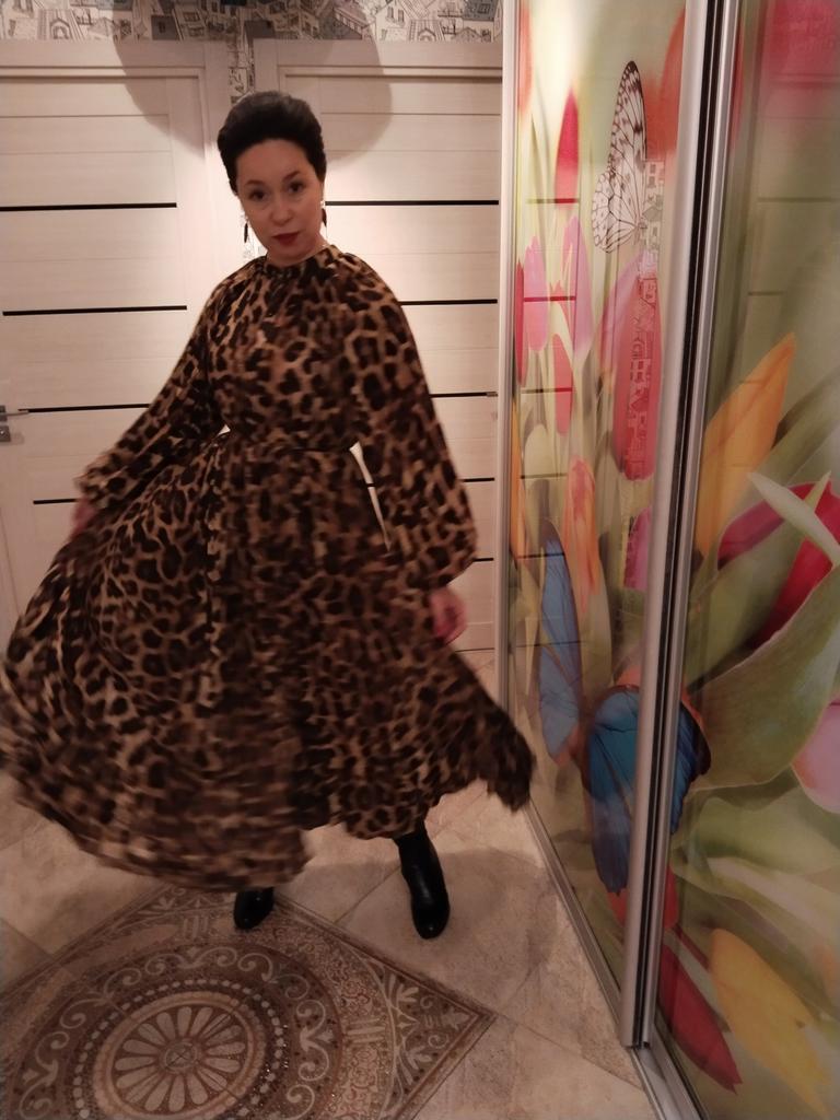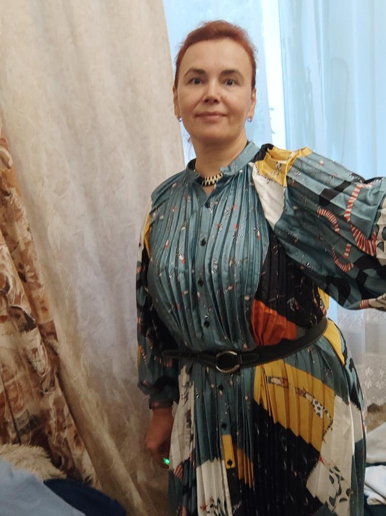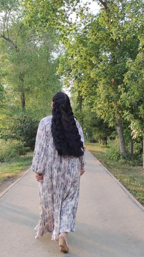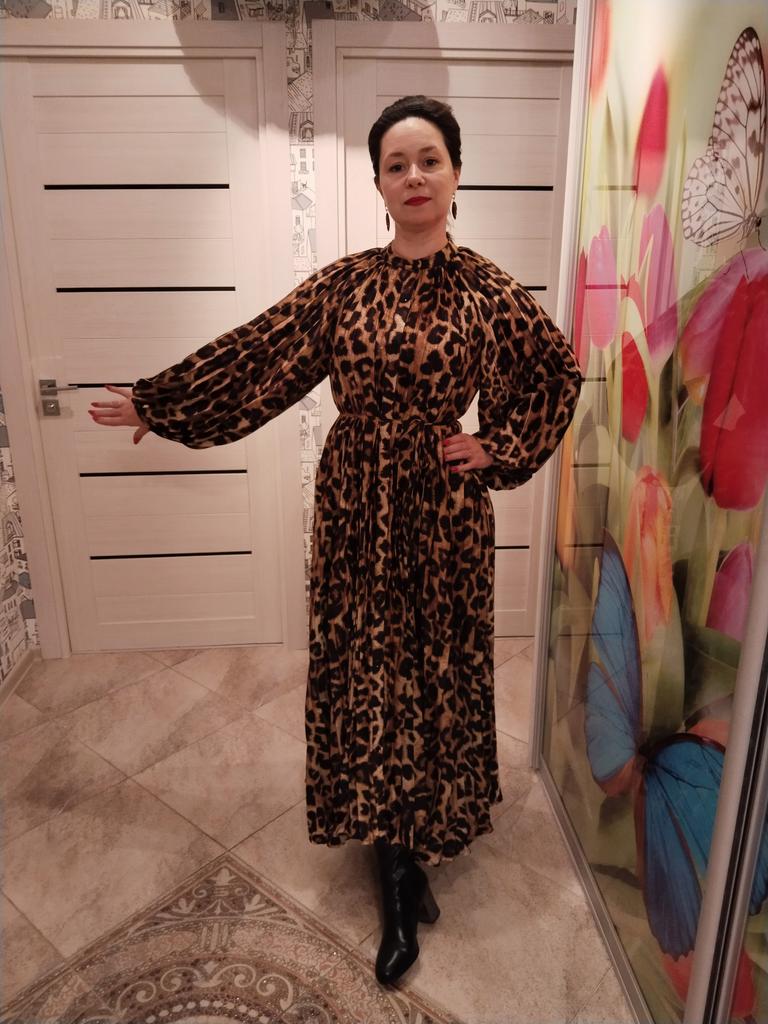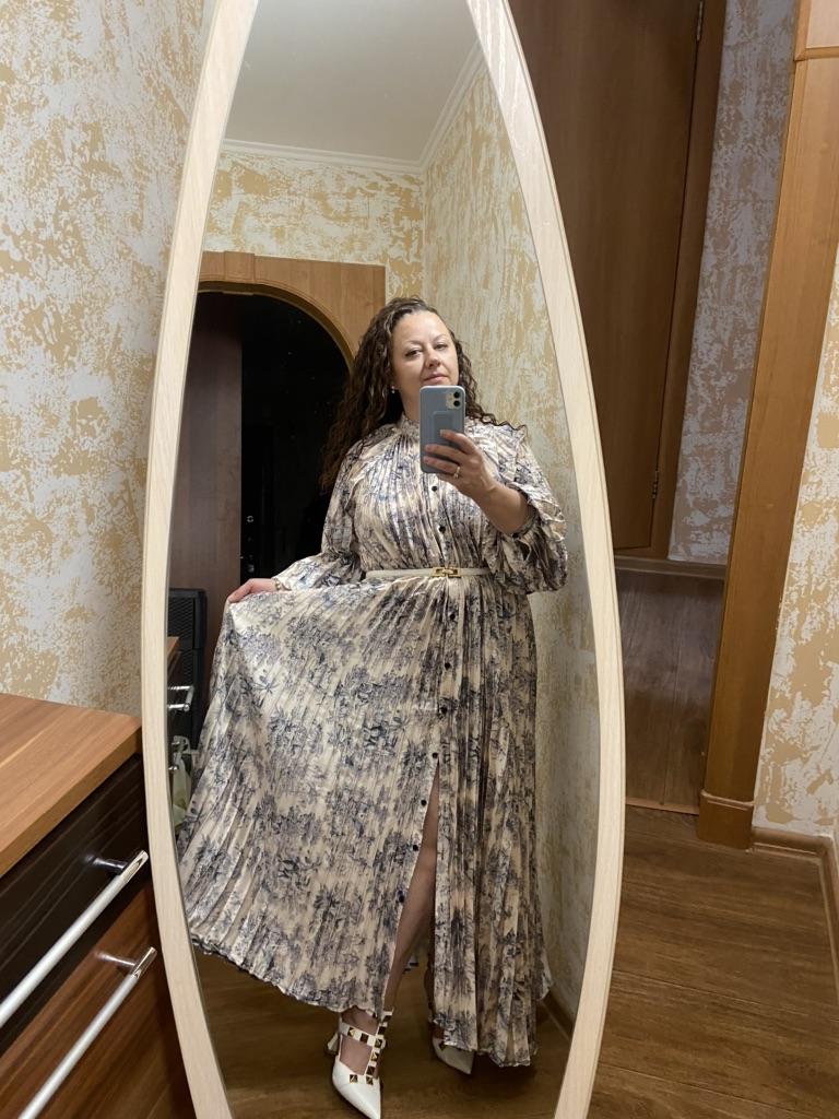 Very beautiful long dress, loose, long sleeves and with sun pleats that start at the neckline. 👍💐 The fabric is light but polyester. The small patterns are beautiful with vibrant colors. 🎉💘