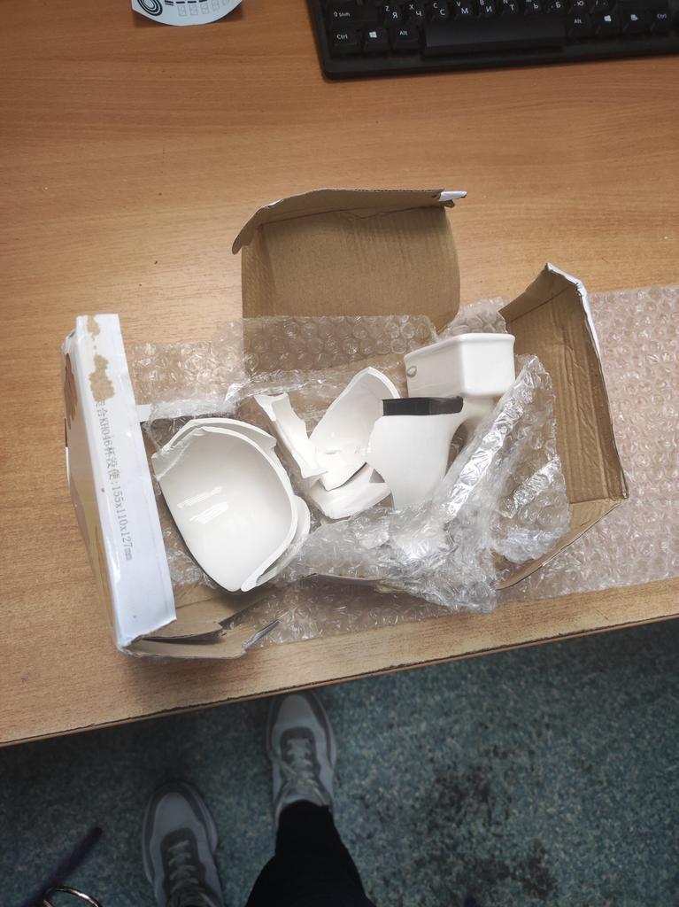 Everything arrived whole. Cool mug, the volume is not small and comfortable to hold in your hand. Anyone who understands humor will appreciate it.