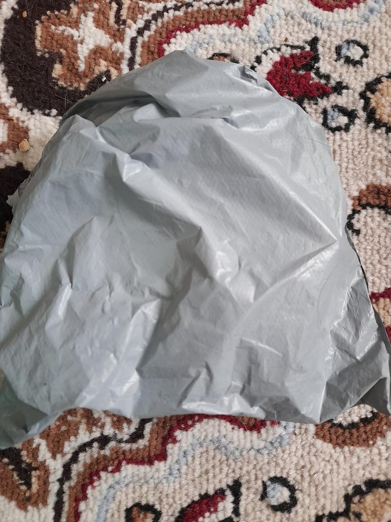 Arrived, whole. You screw in the lamp, it lights up. It's unclear how to turn it off, it doesn't react to claps or other sounds.