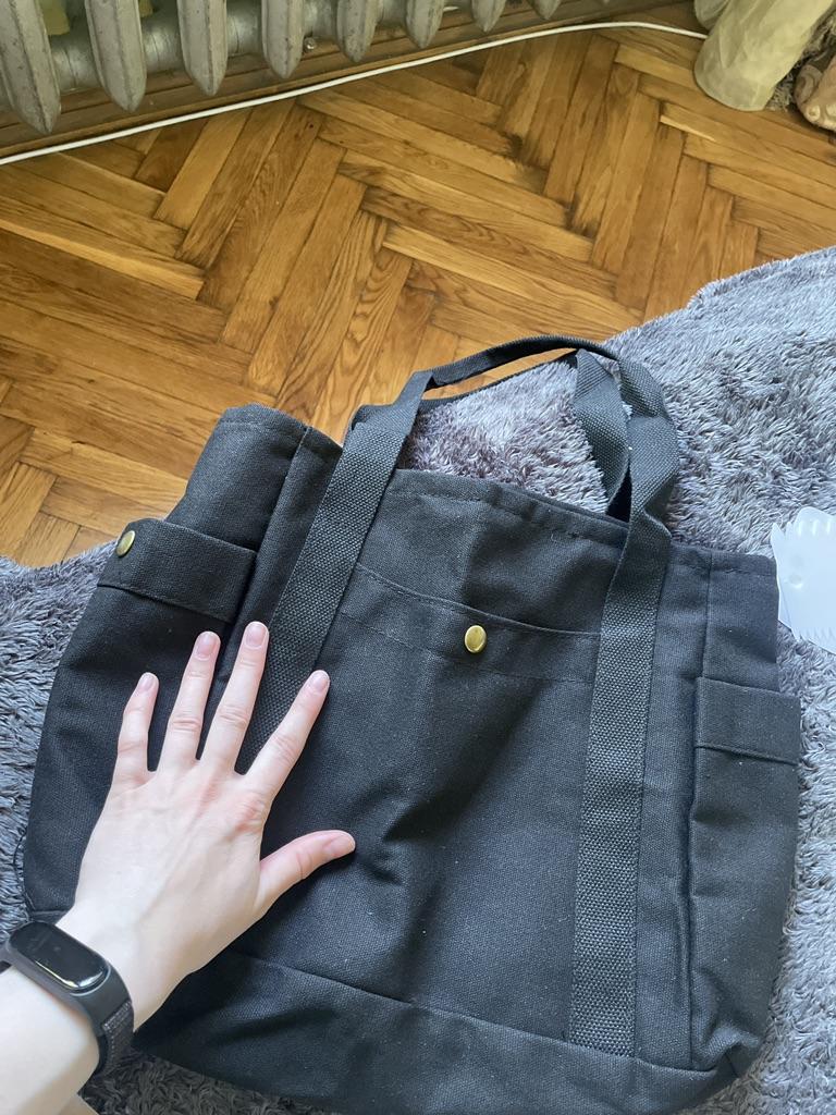 Thick material, optimal size, the purchase was for my daughter for school, we were looking for a bag made of thick fabric that would hold textbooks. There is a lock and an inside pocket.