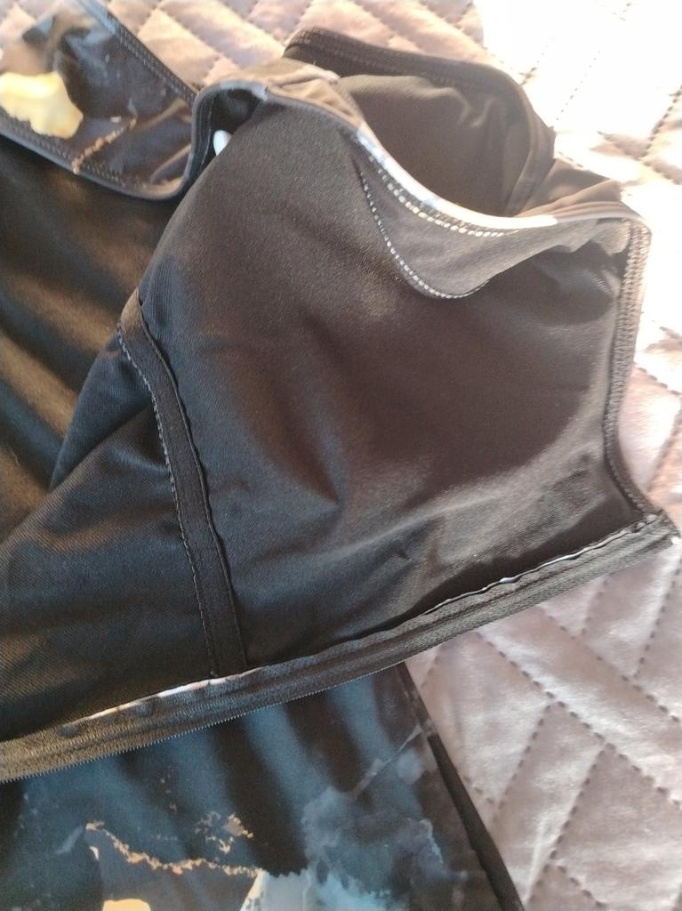 Everything seems good, but the bust, volume 130, lies freely. Nothing holds it there. The cups can be removed. In the intimate areas, it sticks out a bit; the elastic could have been stretched a little more. The material, the lining, is strong, everything is good.