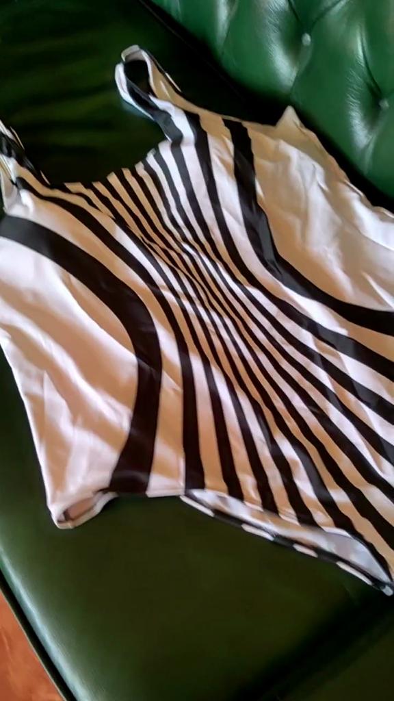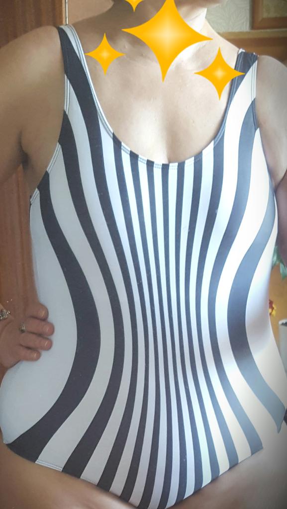 Single-layer swimsuit made of thin, loose elastane, stripes are not neatly slapped on, in the photo they reach the sides, in reality - only along the stomach. The sides are white, which does not make the silhouette slimmer. Does not match the picture. Cheap, simple, stretchy, non-tightening swimsuit. The armholes are long, the armpits are unattractively exposed. Does not hold the chest well. Inserts are placed, they give a little shape. I was really looking forward to it and was disappointed.
