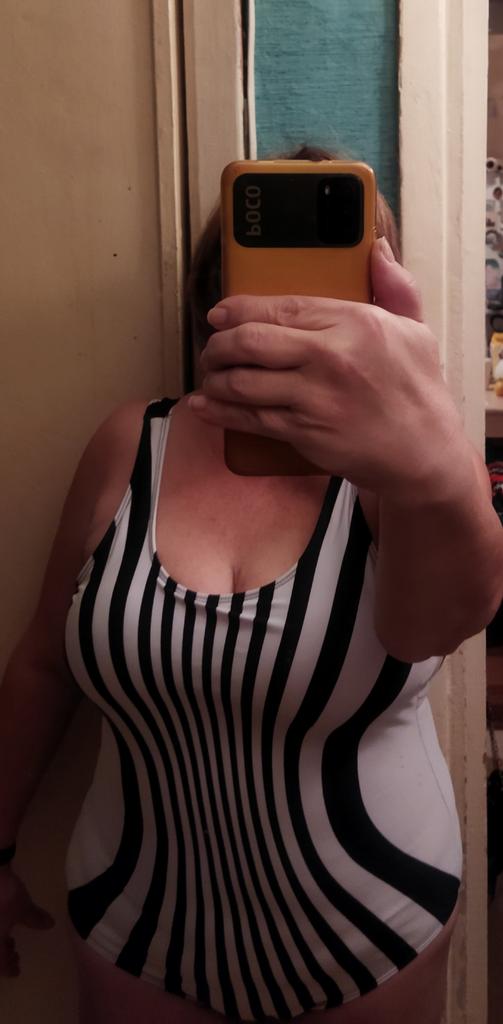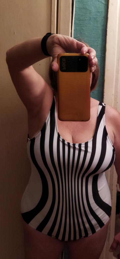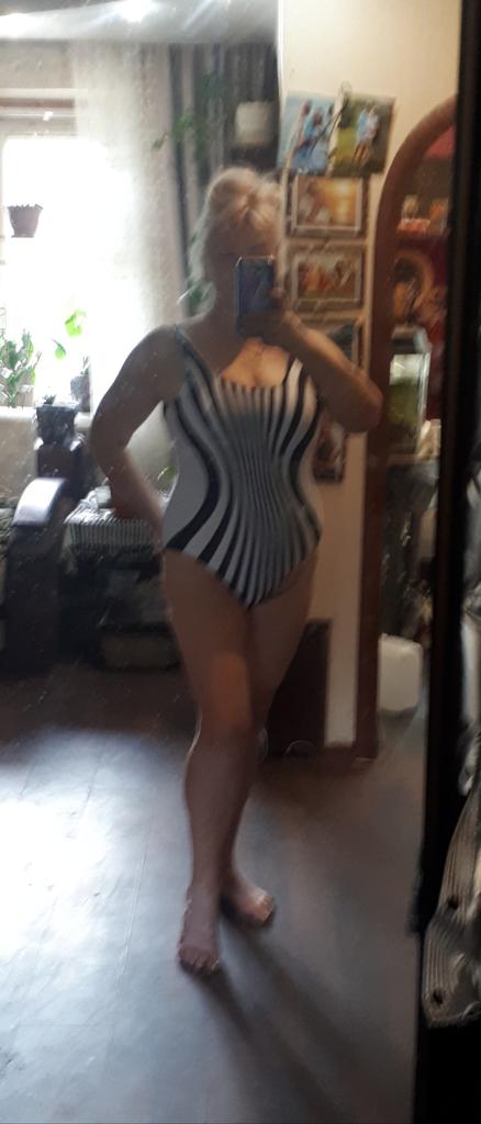 The swimsuit is not bad. The quality is good. The cups are not very large. Up to the 3rd breast size! It will not fit a larger one. It dries quickly, but it is more sporty. In the picture, the stripes converge and it looks different, but in reality, these are just ordinary stripes. The photo does not correspond to reality. For size 56, 4xl fits. If there were real photos, I would not have taken it.
