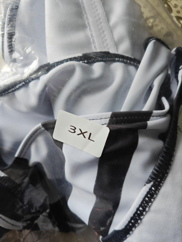 It's not very clear in the picture, because the model is thin, I want to clarify that the swimsuit is white with black stripes. There is a lot of white in large sizes. Now if it were black with white stripes, then it would make you look slimmer. But it's not.