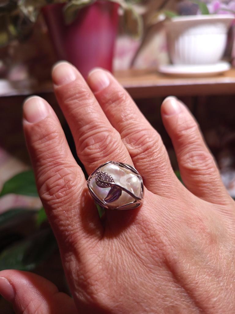 The ring is beautiful, of a very unusual shape, it's good that the size is adjustable! The ring is for those who love costume jewelry and often change it to match their clothes and events. The pearls are natural with a beautiful setting! Thank you!