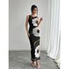 Spring Summer Women's Black Mesh Printed Sleeveless Long Dresses