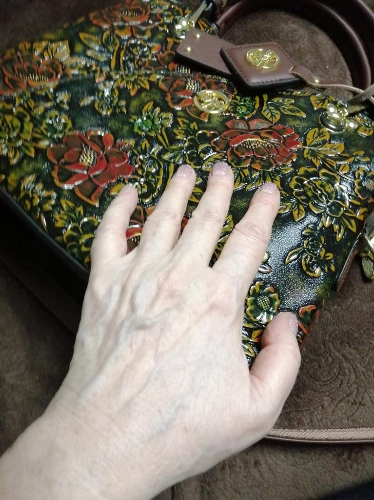 Very beautiful, the green color of the leaves will probably be noticeable outside. The hardware is great. There is a lot of space inside and two more small pockets. The front and back compartments close with a button. The back pocket closes with a zipper. Special thanks for the packaging. The box, the bags, and another bag, and it was tightly packed with paper inside. No deformation.