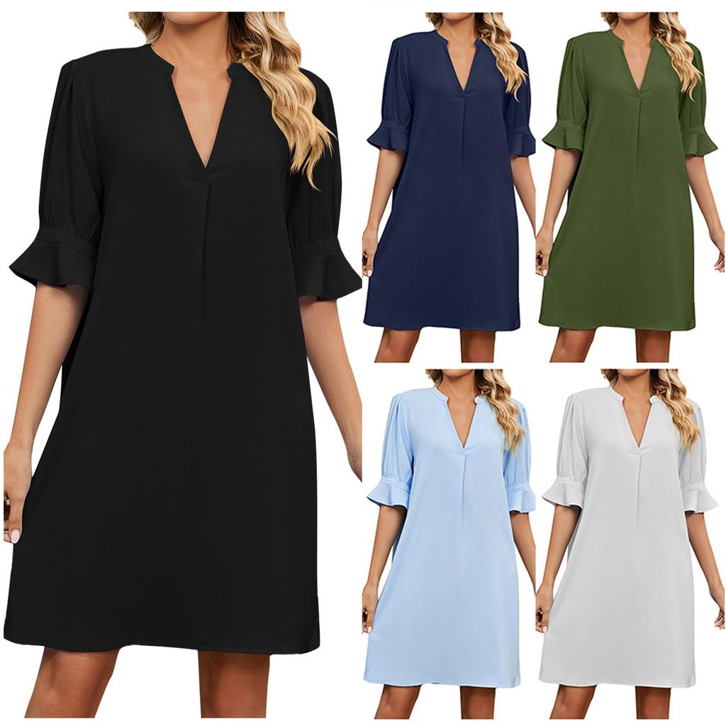 Women's Casual Plain V-neck Loose Pleated Five-quarter Sleeve Dress Summer