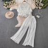 Fancy Adult Lady Like Woman Women's Lightly Mature Waist Trimming Ruffles Ruched Puff Sleeve Top High Waist Wide Leg Suit