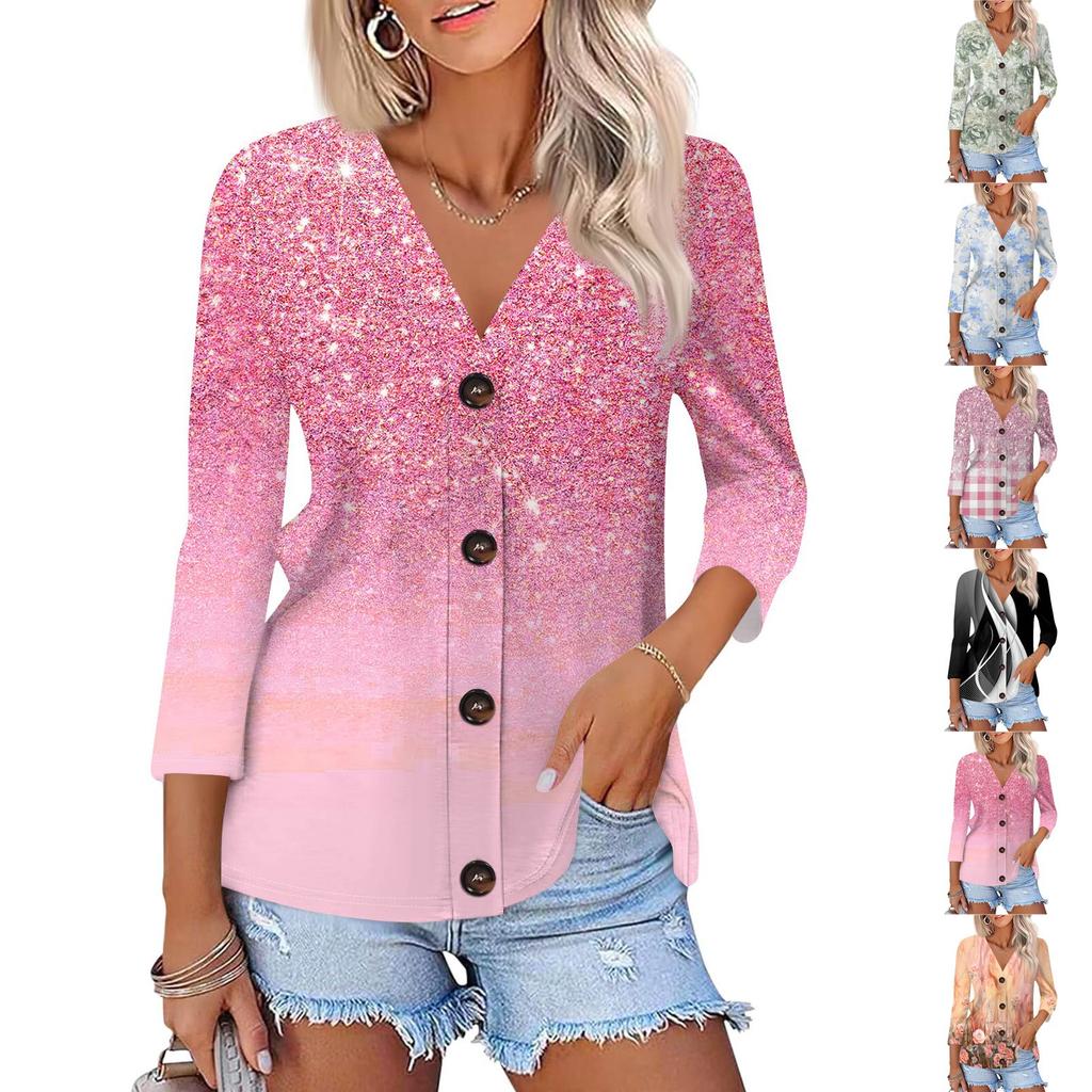 Women's Fashion Casual Printing Button-down Shirt 3/4 Long Sleeve Tops