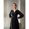 European and American V-neck Lace-up Waist Hugging Pleat Elegant Black French Style Long Dress Black Long Dress