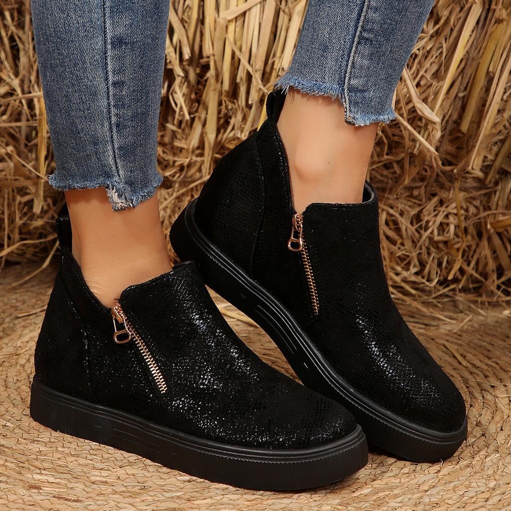 Fashion Sexy Black Shiny Snake Pattern Casual Shoes Women 2025 Summer Double Zip Decoration Round Toe Low Heel Ankle Boots Punk Sneaker