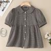 VONDA Women Doll Collar Puff Sleeve Button Up Plaid Blouse Tops
