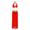 Womens Belly Dance Outfit Halter Backless Crop Top Split Mesh Skirt Sequin Tassel Metallic Party Wear