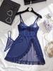 European & American Sexy Spaghetti Strap Mesh Lace Nightgown with Thong and Slit Skirt