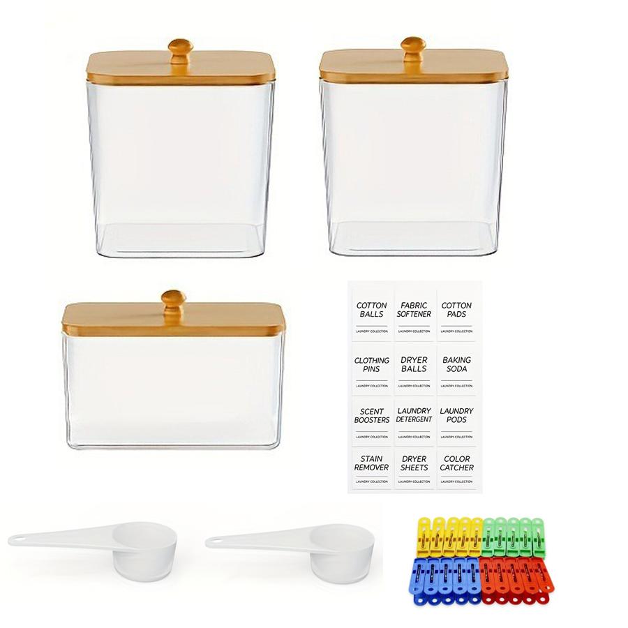 Laundry Pods Container and Dryer Sheet Holder Set, Clear Laundry Room Organization Containers with Bamboo Lids, Scoops for Pods