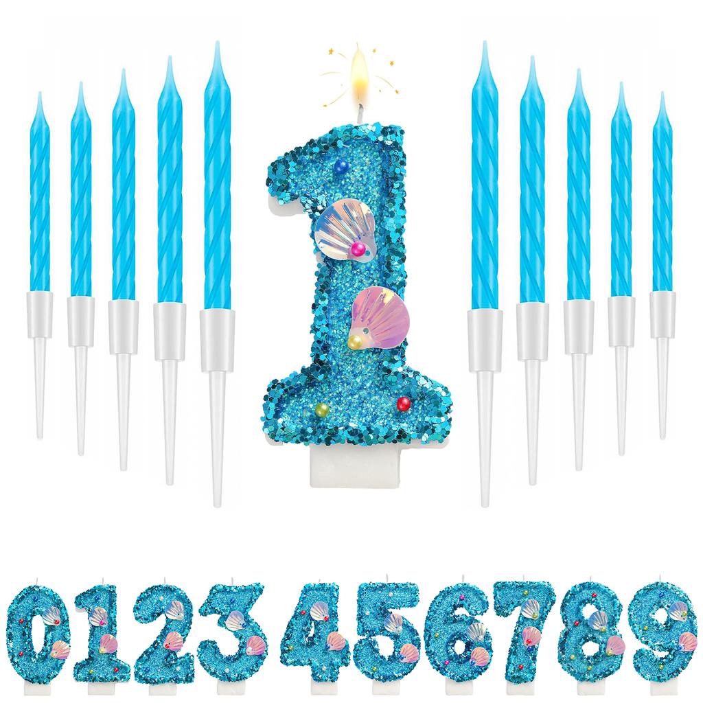 11pcs Blue Number Candle,Shell Sequins Number Candles for Birthday Cakes Mermaid Themed Party Supplies Number 0-9 Candle