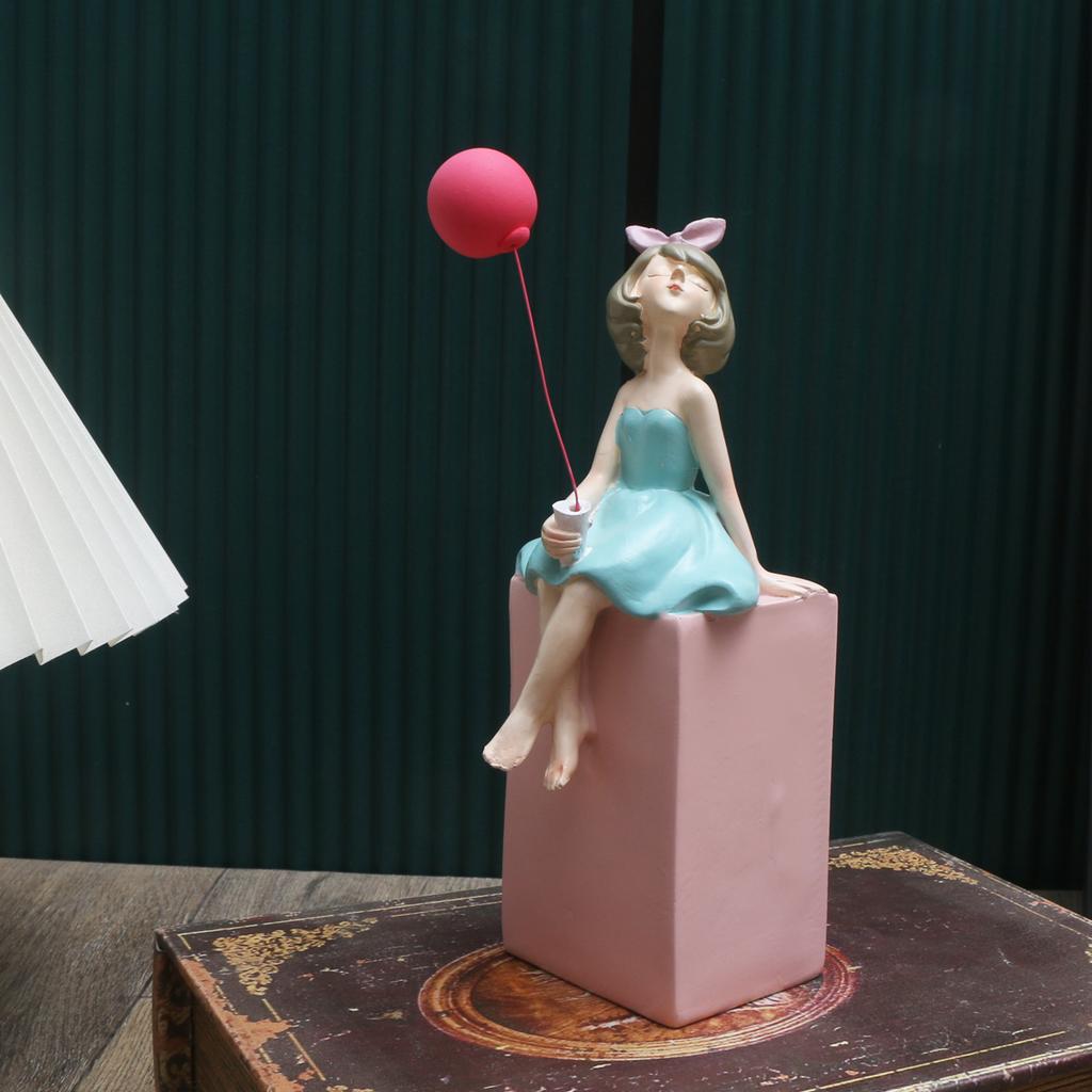 1pc Whimsical Cartoon Girl with Balloon Resin Figurine - INS Style Home Decor Accent, Light Blue Dress, Pink Base, Ideal for Var