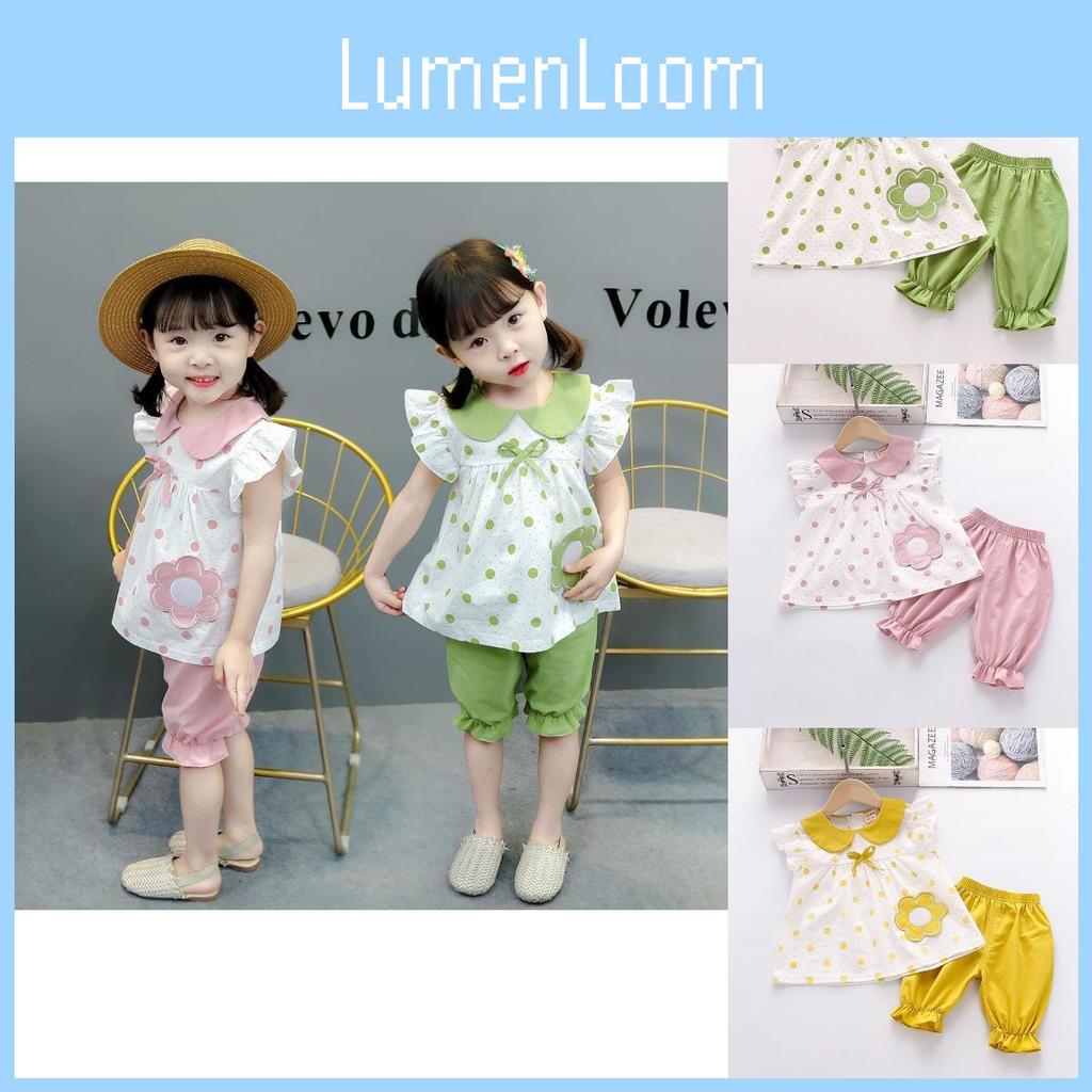 The outfit includes a short-sleeved top that is easy to slip on, making dressing up a breeze for busy parents. The top, while stylish, also provides ample room for movement, perfect for active toddlers. Paired with cute three-quarter length pants, this ensemble boasts a practical yet fashionable design. The pants are not only comfortable but also feature lovely lace and bow details, adding a touch of sweetness that will enchant everyone who sees your little one in it.