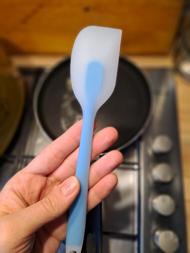Excellent silicone spatula for cooking Small, but very convenient. heat resistant. Length 21 cm, spatula size 7*4 cm. Made of high-quality flexible silicone, odorless. I recommend!