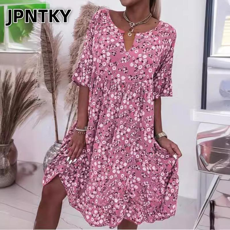 JPNTKY Women's Fashion Summer Spring Short Sleeve V-Neck Casual Dresses