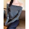 T-shirt chic grigia a righe monospalla a maniche lunghe - Top da donna autunnale in stile coreano slim fit con spalle scoperte