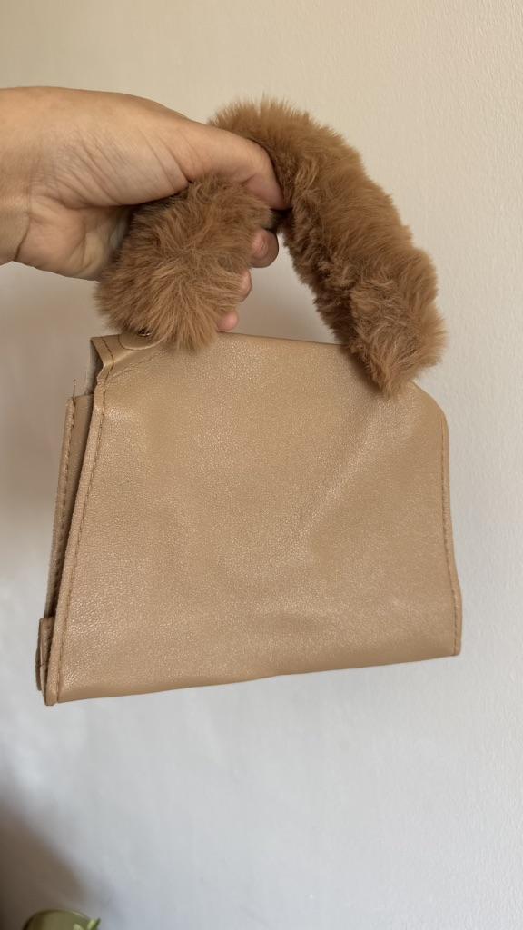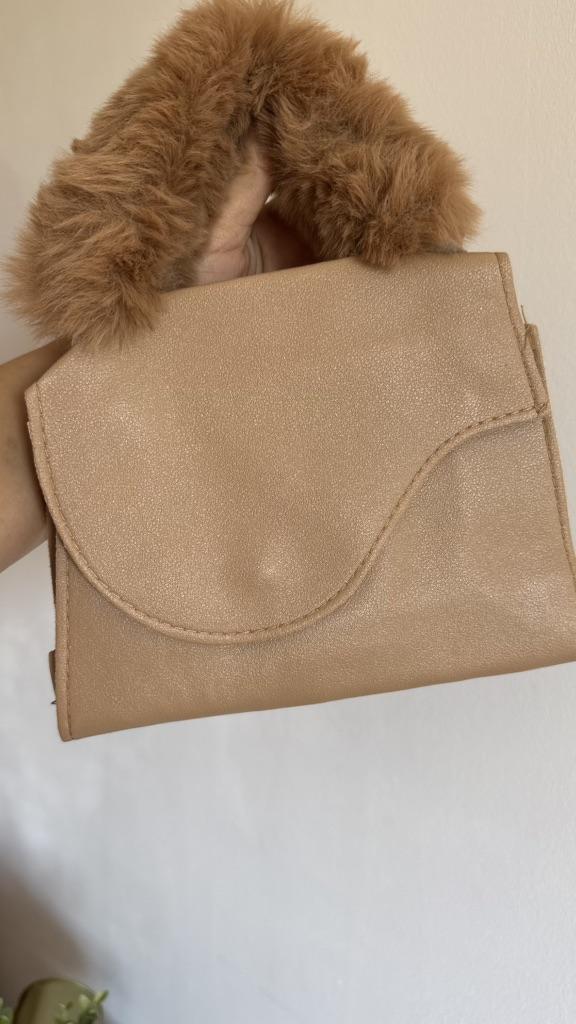 Den kan bæres som en håndveske ved hjelp av det fluffy håndtaket eller som en skulder- eller crossbody-veske med den justerbare gullfargede kjeden, noe som gir fleksibilitet til å passe forskjellige personlige stiler og aktiviteter.
