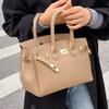 This bag has a stylish trapezoidal silhouette crafted from top - layer cowhide leather. It features short top handles, a detachable thin shoulder strap, a metal lock - like decor on the front, and a zipper closure, presenting an elegant and modern look.