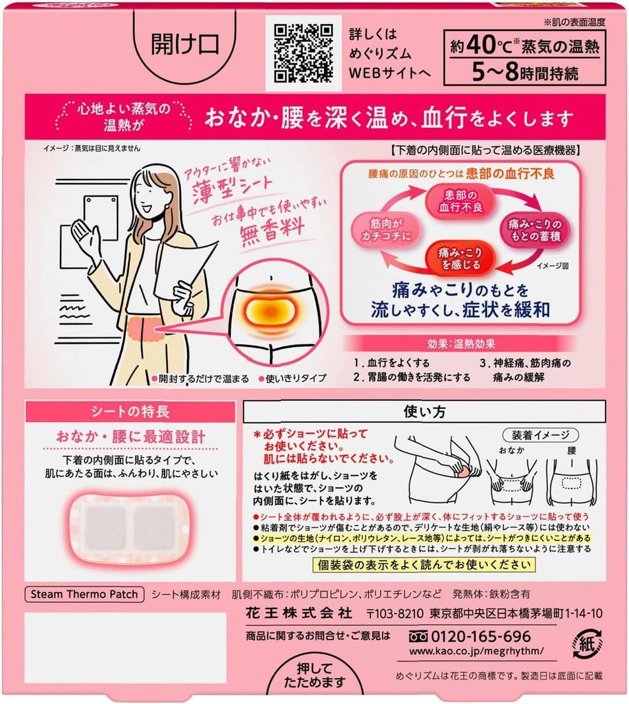 Gently warming your body as you go about your daily life, the Megurizum Steam Heating Sheet is a comfortable item that simply adheres to the inside of your underwear. It provides approximately 40°C of steam heat for 5-8 hours, gradually warming your body deeply and promoting blood circulation. It gently alleviates menstrual discomfort, chilly feelings, and lower back fatigue caused by long hours of desk work. Designed to be applied inside your underwear, it's discreet and safe for use on the go or at work. It's fragrance-free, making it ideal for those sensitive to fragrances. It's gentle and easy to use every day, as it doesn't adhere directly to the skin. Compact, individually packaged, it's easy to carry. Keep it in your pouch for instant relief in case of sudden chills. The five-sheet pack is the perfect size for a quick trial, travel, or everyday use. Warm your body from the inside out for comfort and support during your busy days. Just one sheet will be a reliable ally during those tough times when you're feeling the cold, and it will help you get into the warming habit of feeling lighter in both mind and body.
