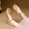 Fashion Summer Women Sandals Concise Square Toe Chunky Heel Women Shoes High Heel Genuine Leather Shoes Golden Weave Sandals for Women