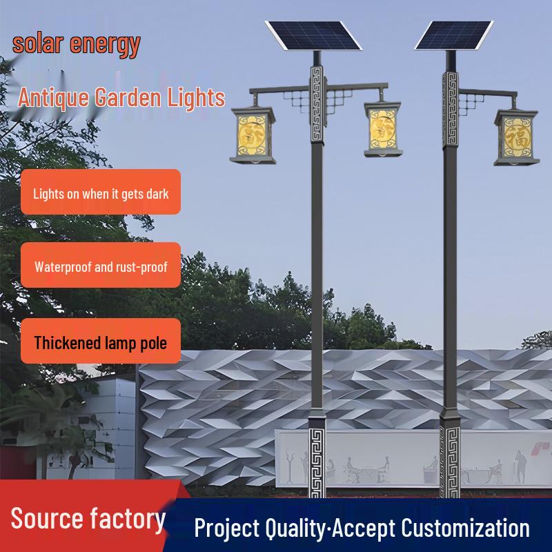 Illuminate your outdoor spaces with elegance and sustainability using these solar-powered street lights. Designed with a nod to ancient Chinese aesthetics, these lights seamlessly blend tradition with modern technology. Ideal for parks and courtyards, they offer high brightness to enhance nighttime visibility and ambiance. The energy-efficient solar panels charge during the day, ensuring reliable performance throughout the night. Built for durability, these street lights withstand various weather conditions while adding a touch of antique charm to any setting.